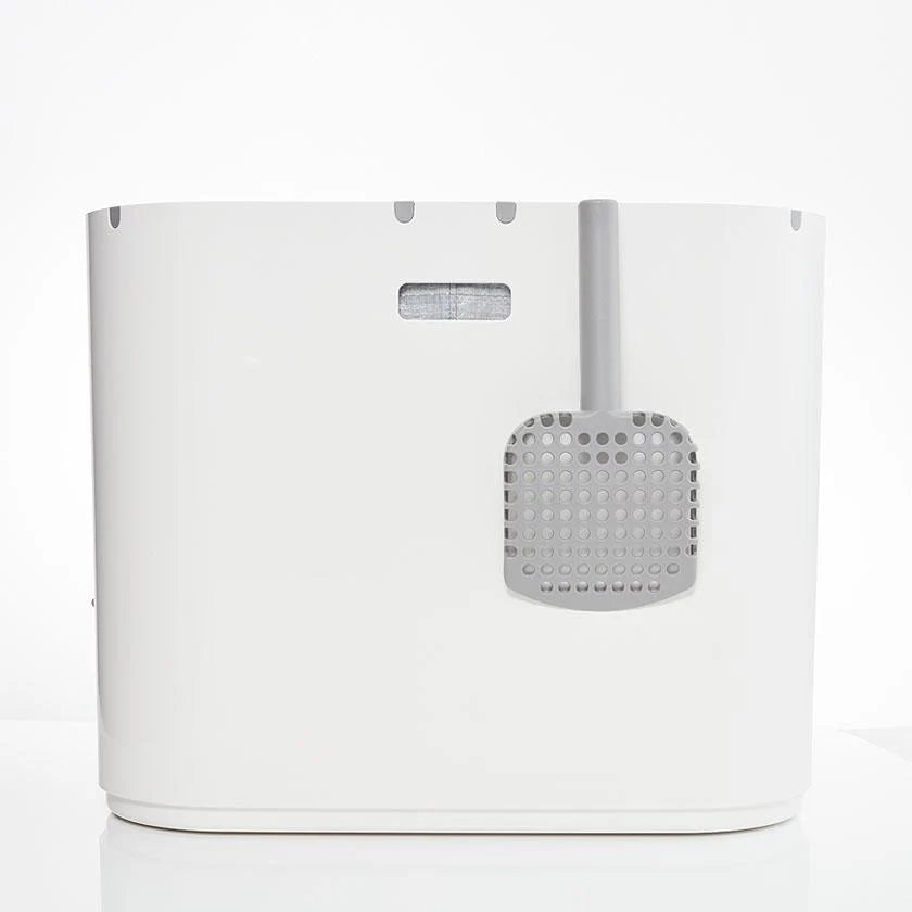 XL has a tall, seamless base that keeps the mess inside. Perfect for side pee-ers! Hang the included scoop on either side for quick access.